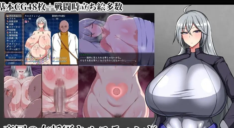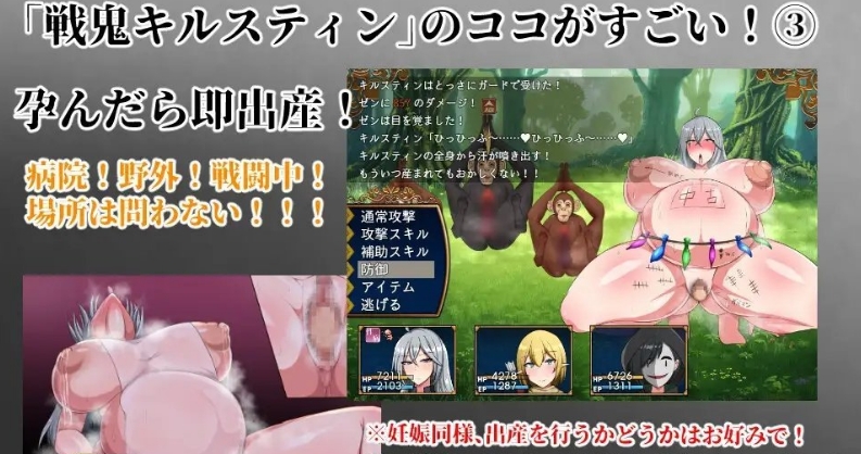 由剧情简介就能知道这款是注重怀孕要素的游戏,于是被雷普之后马上受精,在旅馆睡觉之后就长出西瓜肚。在西瓜肚的时候可以无视这状态继续冒险,怀孕的状态对能力值没有影响。也可以选择到医院去生产,并且登录在母子手册上,算是一种收集要素。虽然女主为了要继续冒险而选择将孩子委托医院送走,但是在母子手册之中可以看到其实女主对孩子有着满满的爱意。可是就算满怀着爱意,要是带着大肚子冒险的话毕竟还是蛮危险的。象是一开始的腹击袋鼠,要是被牠打两次肚子的话可是会直接流产的。其他也有一些怪会造成流产、死胎的效果,虽然没有特别的演出跟文字描述,可是是有带血的胎儿等画面。工口部分的演出是罐头音效与静态CG,部分场景的阴道透视图会是动态的。而情境部分是战败后的雷普H为主,只是要注意不是所有的怪都有战败H。而有些怪有战斗H,象是被腹击袋鼠打两次肚子就会被牠肛交,而中了盗贼的睡眠粉也会被H。还有就是村中的H事件,象是用自己的爆乳来帮忙为了产奶量大跌而烦恼的酪农。