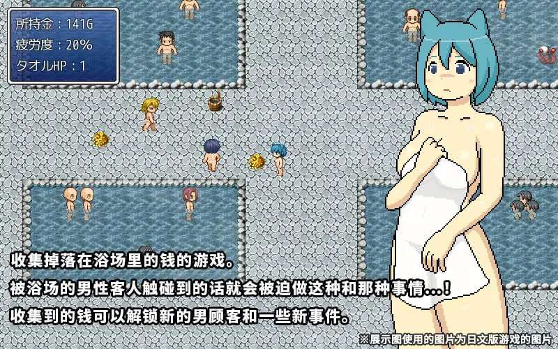 这是一款在浴场捡钱的游戏。被浴场的男性客人捉住的话会被做口工的事情。筹集资金之后会出现新的男性客人,解锁更多事件。没有什麽特别深刻的故事,也没造成游戏结束的元素。