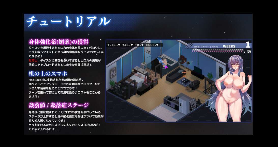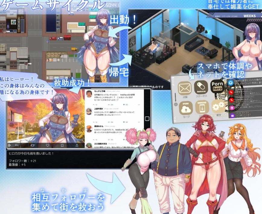 在主屏幕(自宅)中,丰满的3Dヒロカ在各处被邪恶的权力者凌辱。为了守护街道而需要强化媚药的ヒロカ无法反抗……